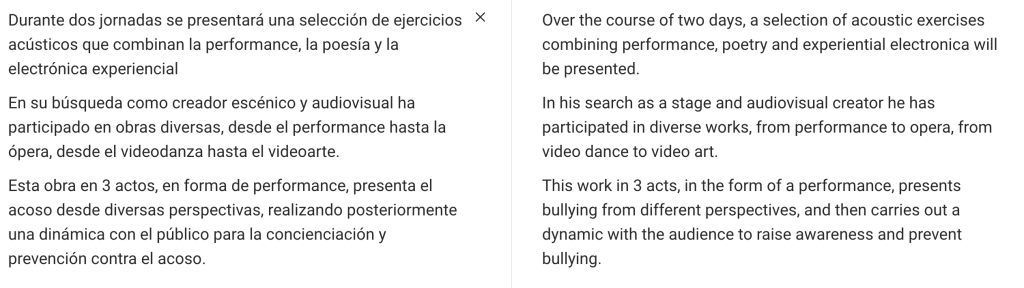 Nonetheless, unlike with other pseudo-anglicisms such as “rider” to refer to delivery workers, a context in which English would never use the word, there is enough semantic overlap between “performance” and “performance art” to confuse even a careful translator. In fact, bilingual dictionaries such as Collins give “performance” as the English translation of Spanish “performance”, and relatively good MT engines don’t usually pick up on the difference, either, as I saw for myself when I tried putting three sentences (originals found here, here, and here) through DeepL. Since you never step in the same machine translation engine twice, and DeepL in particular is rapidly improving, it’s possible that the same exercise a few months from now will offer different results, but as of February 2025 the machine, just like Collins and many human translators, seems to be operating under the assumption that the two “performances” are synonymous: