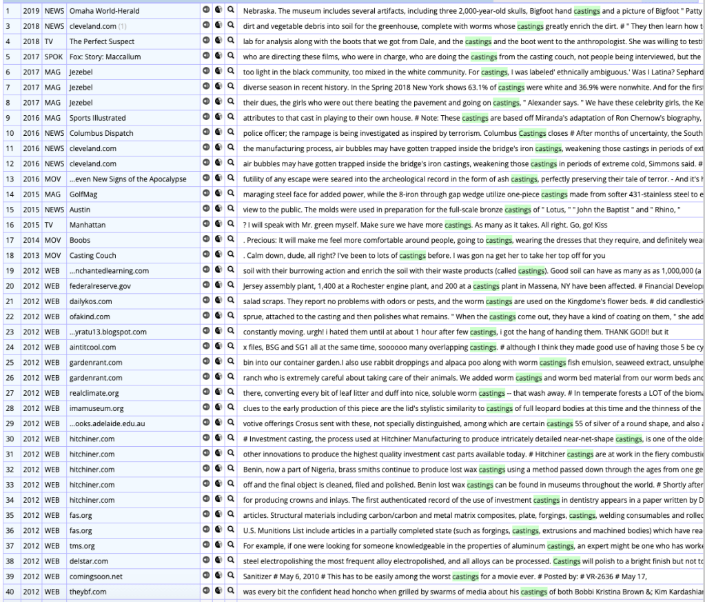 Casting: This one could be considered a partial psuedo-anglicism. When it refers to the process of choosing actors or performers for certain parts in a show or movie, the terms are used in the same way across languages: a “director de casting” is indeed a “casting director,” for example. Things get a bit more complicated when it comes to the events in which casting takes place, that is, where people try out for parts in the hopes of being picked. Before show biz people jump down my throat: yes, I know that such events can be referred to as “castings.” However, they are much more frequently referred to as either “casting calls” or “auditions.” The use of “casting” as a count noun (i.e., a noun that can be pluralized or take an indefinite article) is not common in English, as seen on the Corpus of Contemporary American English (COCA): there are only 357 hits for “castings,” and several of them refer to a very different kind of casting (I’m aware that there’s a genre filter on COCA, but it didn’t help much in this case).